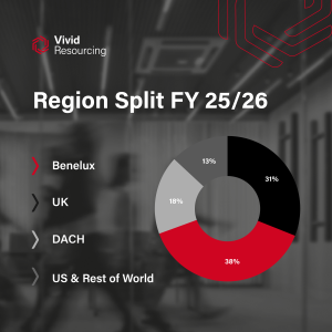US & Rest of World contributed 13.08%, representing a key growth area. Across Scandinavia, Vivid continued to build its presence in engineering markets, while the US – as a relatively new office – gained traction in technology recruitment, particularly across cloud, infrastructure and transformation hiring.